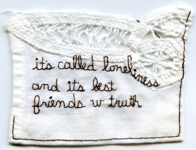 | "Grief." 2013. Embroidery on fabric. 2.75" x 3.75". Text by @EmbroideryPoems. |